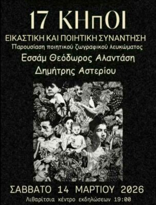 https://www.agon.gr/wp-content/uploads/2026/03/17-Khpoi-228x300.jpeg 228w, https://www.agon.gr/wp-content/uploads/2026/03/17-Khpoi-779x1024.jpeg 779w, https://www.agon.gr/wp-content/uploads/2026/03/17-Khpoi-768x1009.jpeg 768w, https://www.agon.gr/wp-content/uploads/2026/03/17-Khpoi-304x400.jpeg 304w, https://www.agon.gr/wp-content/uploads/2026/03/17-Khpoi-585x769.jpeg 585w" sizes="auto, (max-width: 822px) 100vw, 822px" title="«17 Κήποι» των Εσσάμ Αλαντάση και Δημήτρη Αστερίου 8" />Εκδήλωση για την παρουσίαση του ποιητικού και ζωγραφικού λευκώματος «17 Κήποι» πραγματοποιείται το Σάββατο 14 Μαρτίου, στις 7 το απόγευμα, στην αίθουσα εκδηλώσεων του συγκροτήματος Λιθαρίτσια (στο πάρκο Λιθαρίτσια).