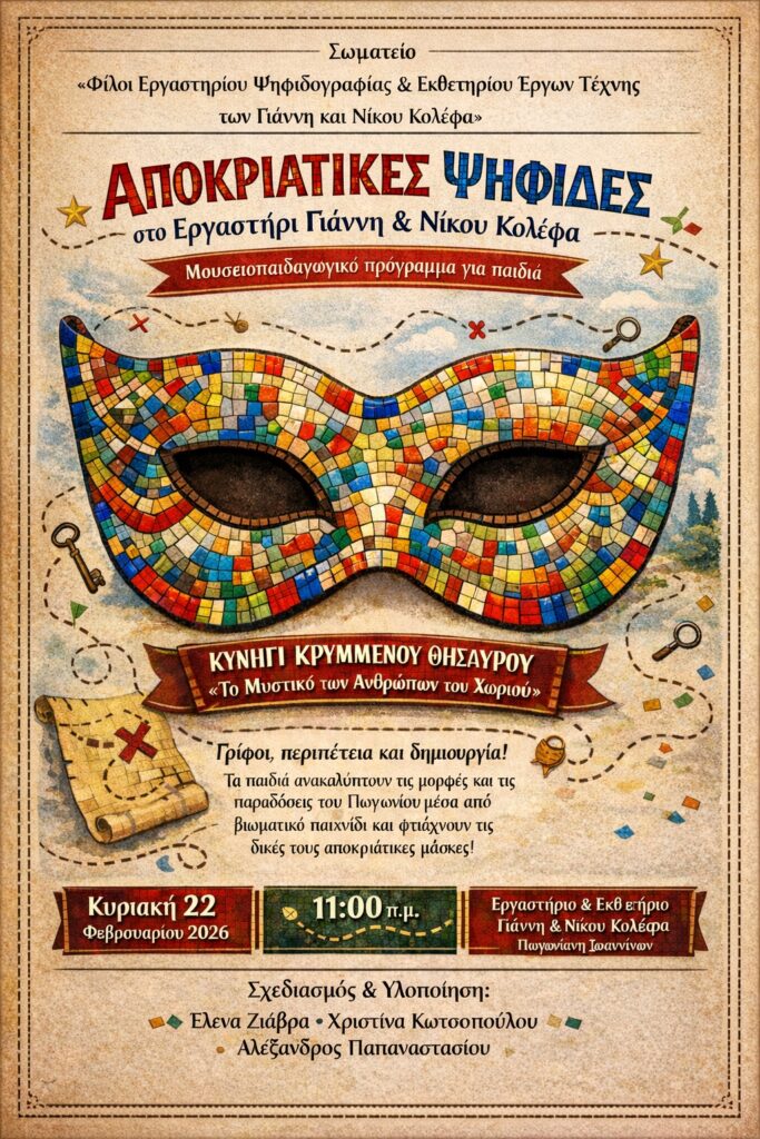 https://www.agon.gr/wp-content/uploads/2026/02/apokriatikes-psifides-pog... 200w, https://www.agon.gr/wp-content/uploads/2026/02/apokriatikes-psifides-pog... 683w, https://www.agon.gr/wp-content/uploads/2026/02/apokriatikes-psifides-pog... 768w, https://www.agon.gr/wp-content/uploads/2026/02/apokriatikes-psifides-pog... 960w, https://www.agon.gr/wp-content/uploads/2026/02/apokriatikes-psifides-pog... 267w, https://www.agon.gr/wp-content/uploads/2026/02/apokriatikes-psifides-pog... 585w" sizes="auto, (max-width: 720px) 100vw, 720px" title="Αποκριάτικες ψηφίδες στο Εργαστήρι Γιάννη και Νίκου Κολέφα 10" />Την τέχνη του ψηφιδωτού και την ιστορία των Γιάννη και Νίκου Κολέφα θα έχουν την ευκαιρία να γνωρίσουν οι μικροί φίλοι του Εργαστηρίου Ψηφιδογραφίας και Εκθετηρίου έργων τέχνης, που λειτουργεί στην Πωγωνιανή, μέσα από μια συναρπαστική περιπέτεια, την Κυριακή 22 Φεβρουαρίου, στις 11 το πρωί.