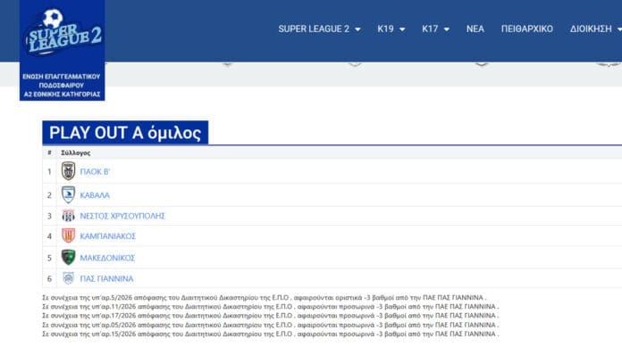 Σε συνέχεια της υπ’αρ.15/2026 απόφασης του Διαιτητικού Δικαστηρίου της Ε.Π.Ο , αφαιρούνται προσωρινά -3 βαθμοί από την ΠΑΕ ΠΑΣ ΓΙΑΝΝΙΝΑ .