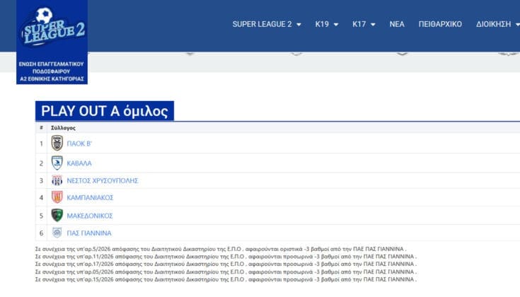 Ούτε Σάββατο δεν σταματάνε να ανακοινώνονται ποινές αφαίρεσης βαθμών στον ΠΑΣ Γιάννινα, καθώς πριν από λίγο η Super League 2 αφαίρεσε άλλους 6 βαθμούς από τους “κυανόλευκους” εμφανίζοντάς τους με -7 στον βαθμολογικό της πίνακα, εφαρμόζοντας ποινές του Διαιτητικού Δικαστηρίου!