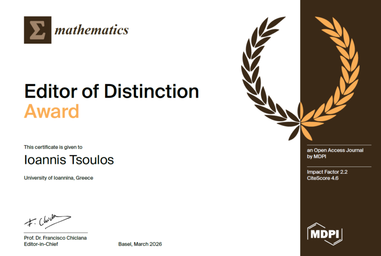 https://www.agon.gr/wp-content/uploads/2026/03/award-Tsoulos-300x202.png 300w, https://www.agon.gr/wp-content/uploads/2026/03/award-Tsoulos-1024x689.png 1024w, https://www.agon.gr/wp-content/uploads/2026/03/award-Tsoulos-768x517.png 768w, https://www.agon.gr/wp-content/uploads/2026/03/award-Tsoulos-960x646.png 960w, https://www.agon.gr/wp-content/uploads/2026/03/award-Tsoulos-594x400.png 594w, https://www.agon.gr/wp-content/uploads/2026/03/award-Tsoulos-585x394.png 585w" sizes="auto, (max-width: 1200px) 100vw, 1200px" title="Διεθνής διάκριση για τον καθηγητή του Πανεπιστημίου Ιωαννίνων Ιωάννη Τσούλο 10" />Μια σημαντική διεθνή αναγνώριση έλαβε ο διευθυντής του Εργαστηρίου Γνώσης και Ευφυούς Πληροφορικής του Τμήματος Πληροφορικής & Τηλεπικοινωνιών του Πανεπιστημίου Ιωαννίνων με έδρα την Άρτα, καθηγητής Ιωάννης Τσούλος, ο οποίος τιμήθηκε με το βραβείο "Mathematics Editor of Distinction Award".