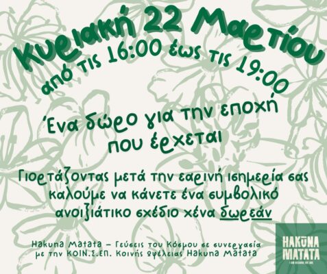 https://www.agon.gr/wp-content/uploads/2026/03/Henna-free_Hakuna-Matata_... 300w, https://www.agon.gr/wp-content/uploads/2026/03/Henna-free_Hakuna-Matata_... 768w, https://www.agon.gr/wp-content/uploads/2026/03/Henna-free_Hakuna-Matata_... 477w, https://www.agon.gr/wp-content/uploads/2026/03/Henna-free_Hakuna-Matata_... 585w" sizes="(max-width: 940px) 100vw, 940px" title="Γιορτή της άνοιξης με δωρεάν σχέδιο χένας 2" />Με αφορμή τον ερχομό της άνοιξης, η ΚΟΙΝ.Σ.ΕΠ. Κοινής Ωφέλειας Hakuna Matata προσκαλεί το κοινό σε μια ξεχωριστή γιορτή συνάντησης, δημιουργίας και πολιτισμικής ανταλλαγής.