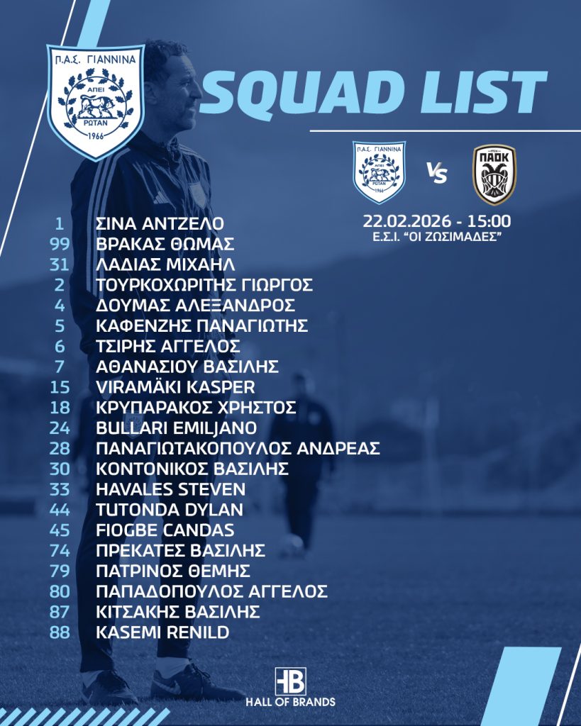 Εκτός είναι οι τραυματίες Ναούμης, Κριμιτζάς, Σελιμάι και για αγωνιστικούς λόγους οι Συμεωνίδης, Καπέρδας και Παυλίδης.