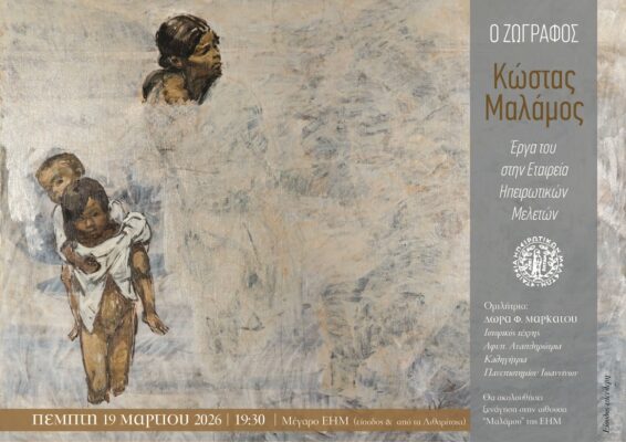https://www.agon.gr/wp-content/uploads/2026/03/Malamos-EHM-afisa-300x212... 300w, https://www.agon.gr/wp-content/uploads/2026/03/Malamos-EHM-afisa-1024x72... 1024w, https://www.agon.gr/wp-content/uploads/2026/03/Malamos-EHM-afisa-768x542... 768w, https://www.agon.gr/wp-content/uploads/2026/03/Malamos-EHM-afisa-960x678... 960w, https://www.agon.gr/wp-content/uploads/2026/03/Malamos-EHM-afisa-566x400... 566w, https://www.agon.gr/wp-content/uploads/2026/03/Malamos-EHM-afisa-585x413... 585w" sizes="auto, (max-width: 1100px) 100vw, 1100px" title="Ομιλία για τον Κώστα Μαλάμο στην ΕΗΜ 7" />Ομιλία με θέμα «Ο ζωγράφος Κώστας Μαλάμος. Έργα του στην Εταιρεία Ηπειρωτικών Μελετών» θα πραγματοποιήσει η ιστορικός της τέχνης, αφυπηρτετήσασα αναπληρώτρια καθηγήτρια του Τμήματος Ιστορίας και Αρχαιολογίας του Πανεπιστημίου Ιωαννίνων Δώρα Φ. Μαρκάτου, την Πέμπτη 19 Μαρτίου, στις 7.30 το απόγευμα, στην αίθουσα «Κ. Κατσάρη» του Μεγάρου της Ε.Η.Μ. (είσοδος και από τα Λιθαρίτσια).
