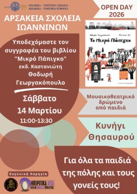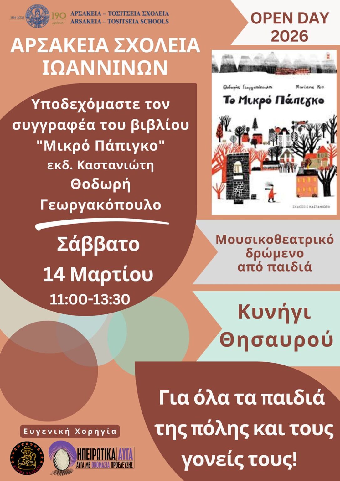 https://www.agon.gr/wp-content/uploads/2026/03/arsakeia-openday-mikro-pa... 212w, https://www.agon.gr/wp-content/uploads/2026/03/arsakeia-openday-mikro-pa... 724w, https://www.agon.gr/wp-content/uploads/2026/03/arsakeia-openday-mikro-pa... 768w, https://www.agon.gr/wp-content/uploads/2026/03/arsakeia-openday-mikro-pa... 1086w, https://www.agon.gr/wp-content/uploads/2026/03/arsakeia-openday-mikro-pa... 960w, https://www.agon.gr/wp-content/uploads/2026/03/arsakeia-openday-mikro-pa... 283w, https://www.agon.gr/wp-content/uploads/2026/03/arsakeia-openday-mikro-pa... 585w" sizes="auto, (max-width: 763px) 100vw, 763px" title="Open Day στα Αρσάκεια με τον Θ. Γεωργακόπουλο και το «Μικρό Πάπιγκο» 10" />Με αφορμή τον εορτασμό των 190 χρόνων προσφοράς στην εκπαίδευση, τα Αρσάκεια Σχολεία οργανώνουν μια διαφορετική Ανοιχτή Ημέρα – Open Day στα Γιάννενα το Σάββατο 14 Μαρτίου, από τις 11 το πρωί έως τις 1.30 το μεσημέρι.