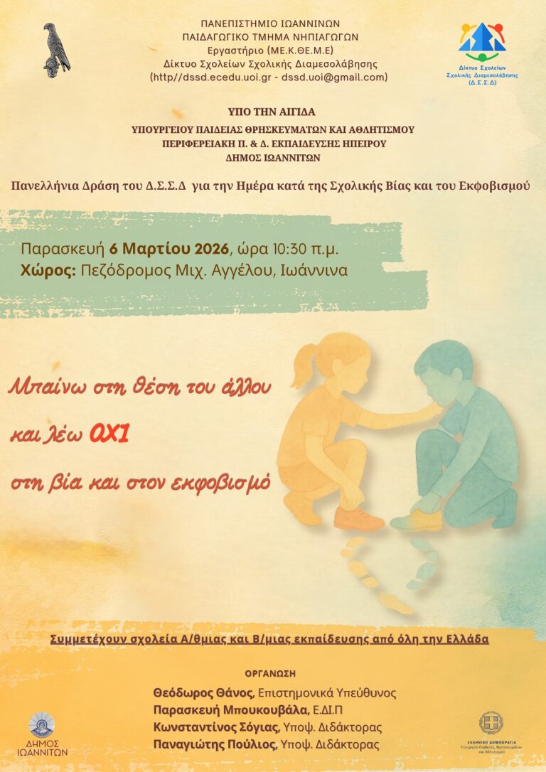 https://www.agon.gr/wp-content/uploads/2026/03/drasi-ekfovismou-afisa-21... 212w, https://www.agon.gr/wp-content/uploads/2026/03/drasi-ekfovismou-afisa-72... 724w, https://www.agon.gr/wp-content/uploads/2026/03/drasi-ekfovismou-afisa-76... 768w, https://www.agon.gr/wp-content/uploads/2026/03/drasi-ekfovismou-afisa-10... 1087w, https://www.agon.gr/wp-content/uploads/2026/03/drasi-ekfovismou-afisa-96... 960w, https://www.agon.gr/wp-content/uploads/2026/03/drasi-ekfovismou-afisa-28... 283w, https://www.agon.gr/wp-content/uploads/2026/03/drasi-ekfovismou-afisa-58... 585w" sizes="auto, (max-width: 764px) 100vw, 764px" title="Όχι στη βία και τον εκφοβισμό με αφετηρία τα Γιάννενα 4" />Την πανελλήνια δράση με τίτλο «Μπαίνω στη θέση του άλλου και λέω όχι στη βία και στον εκφοβισμό» διοργανώνει το Δίκτυο Σχολείων Σχολικής Διαμεσολάβησης (ΔΣΣΔ) του Πανεπιστημίου Ιωαννίνων υπό την αιγίδα του Υπουργείου Παιδείας, Θρησκευμάτων & Αθλητισμού και σε συνεργασία με την Περιφερειακή Διεύθυνση Εκπαίδευσης Ηπείρου, με αφορμή την Πανελλήνια Ημέρα κατά της Σχολικής Βίας και του Εκφοβισμού (6 Μαρτίου).