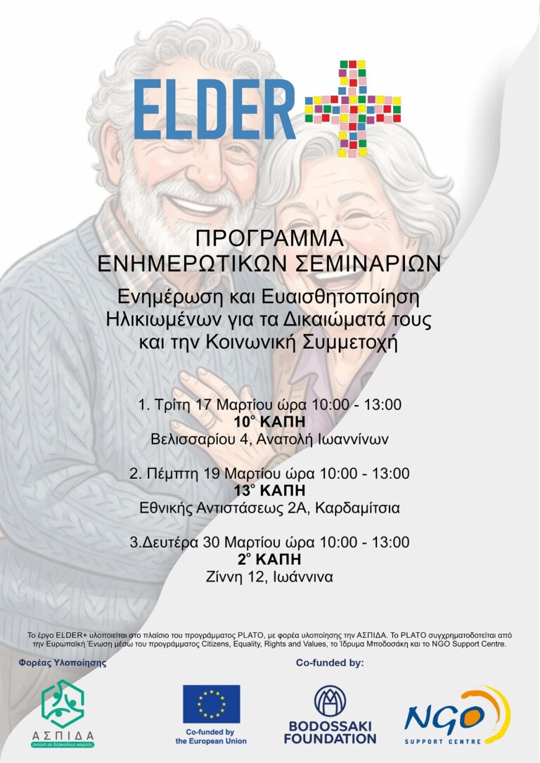 https://www.agon.gr/wp-content/uploads/2026/03/ELDER-poster-212x300.jpg 212w, https://www.agon.gr/wp-content/uploads/2026/03/ELDER-poster-725x1024.jpg 725w, https://www.agon.gr/wp-content/uploads/2026/03/ELDER-poster-768x1085.jpg 768w, https://www.agon.gr/wp-content/uploads/2026/03/ELDER-poster-1087x1536.jpg 1087w, https://www.agon.gr/wp-content/uploads/2026/03/ELDER-poster-960x1356.jpg 960w, https://www.agon.gr/wp-content/uploads/2026/03/ELDER-poster-283x400.jpg 283w, https://www.agon.gr/wp-content/uploads/2026/03/ELDER-poster-585x826.jpg 585w" sizes="auto, (max-width: 764px) 100vw, 764px" title="Σεμινάρια για τα δικαιώματα και την κοινωνική συμμετοχή των ηλικιωμένων 7" />Σειρά ενημερωτικών εκδηλώσεων, που απευθύνονται στους ηλικιωμένους πολίτες των Ιωαννίνων, οργανώνει η ΑΣΠΙΔΑ, Οργάνωση της Κοινωνίας των Πολιτών, στο πλαίσιο του έργου ELDER+.