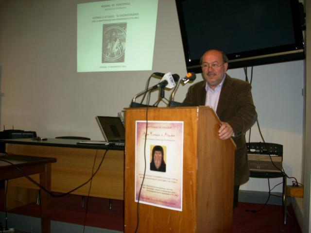 Κεντρικός ομιλητής της εκδήλωσης ήταν ο φιλόλογος – ερευνητής κος Μιχαήλ Παντούλας, ο οποίος ερευνώντας όλον τον Βαλκανικό χώρο συνέλλεξε πληροφορίες από την λατρεία που απέδωσε ο απλός λαός στον Άγιο Κοσμά τον Αιτωλό και φωτογράφησε τις εικονογραφίες (φορητές κα μη) που αναφέρονται στον Άγιο, έτσι όπως τις απόδωσε με το πινέλο του ο ζωγράφος – αγιογράφος της εποχής.