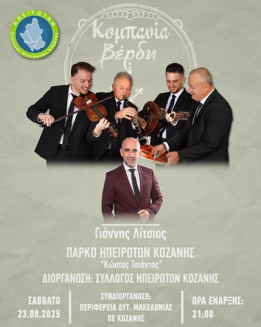 Ο Σύλλογος Ηπειρωτών Κοζάνης με την συνδιοργάνωση της Περιφερειακής Ενότητας Κοζάνης της Περιφέρειας Δυτ. Μακεδονίας σας προσκαλούν το Σάββατο 23 Αυγούστου 2025 και ώρα 9:00 βραδινή, παραμονή της εορτής του Αγίου Κοσμά του Αιτωλού, στο Πάρκο Ηπειρωτών “Κώστας Τσιάντας” σε ένα γνήσιο, παραδοσιακό, ηπειρώτικο πανηγύρι με τον καταξιωμένο κλαρινίστα Κώστα Βέρδη και την ορχήστρα του.